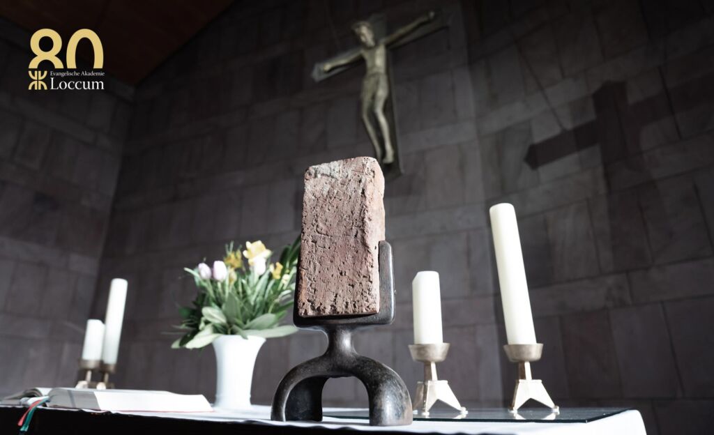 „Was ist das für ein Stein dort auf dem Altar?“ Diese Frage stellen viele Gäste verwundert, wenn sie in Loccum erstmals die Kapelle der Akademie betreten oder an einer Andacht teilnehmen. Dort steht er auf dem Altar, ein roher Ziegelstein, aufrecht, wie ein Ausrufezeichen. Er ist in Bronze gefasst und ragt zwischen Bibel, Kerzen und einem frischen Blumenstrauß mahnend hervor. Darüber erhebt sich das an der Decke hängende Kruzifix.