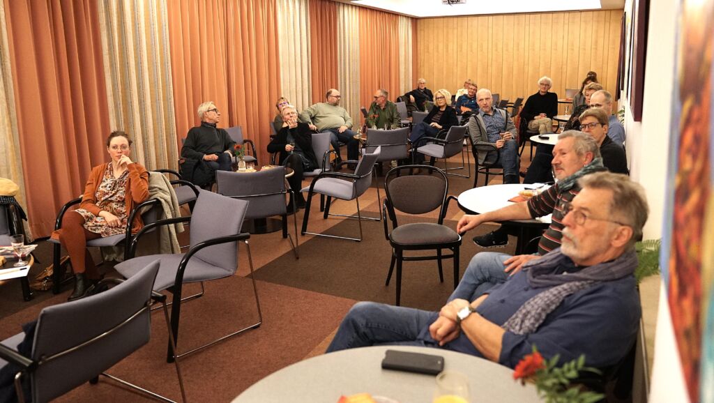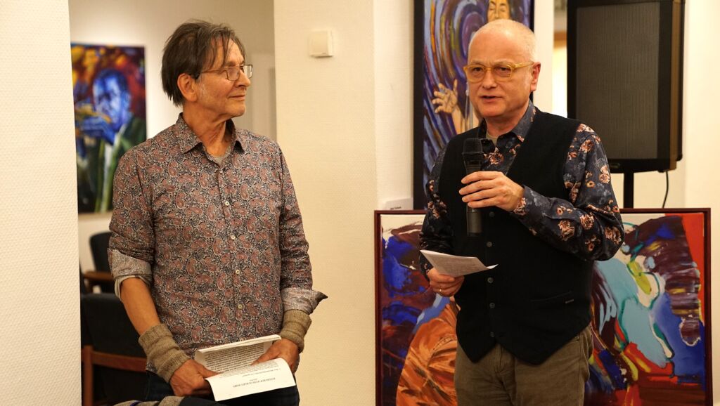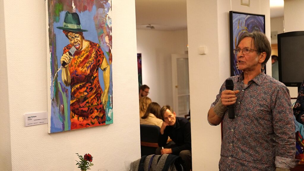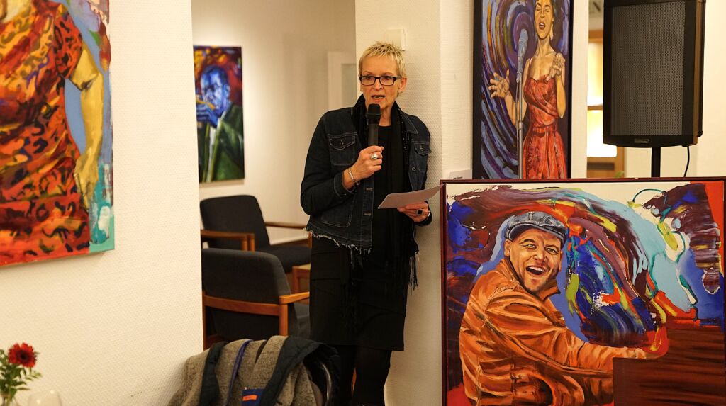 Musik in Farbe und Form sichtbar zu machen, zielt ins Herz des künstlerischen Anliegens von Jürgen Born. In seinen Werken stellt der Künstler Musikerinnen und Musiker bei ihren Jazz-Live-Performances so lebendig dar, dass Silke Leonhard von „synästhetischen Erfahrungen“ beim Kunstgenuss sprach. Was damit gemeint war, wurde beim gemeinsamen Gang durch die Ausstellung deutlich.